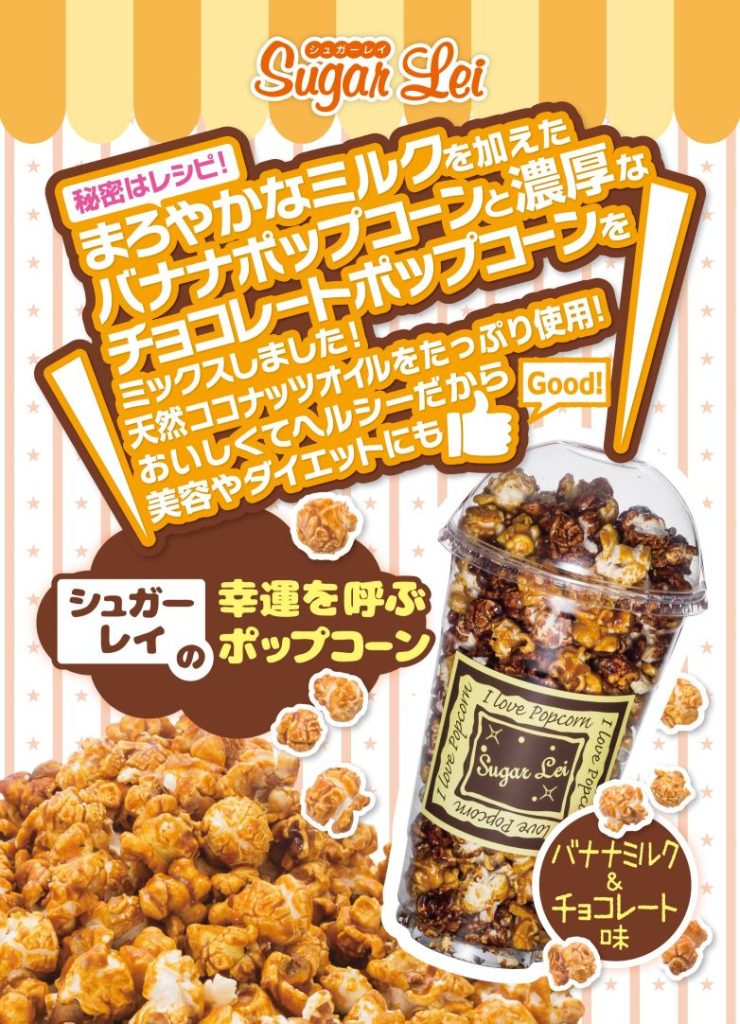 オリジナルミルクシュガーに天然のバナナ果汁を加え、香ばしいチョコレートシロップを加えたミックスポップコーン。贅沢な一品です。