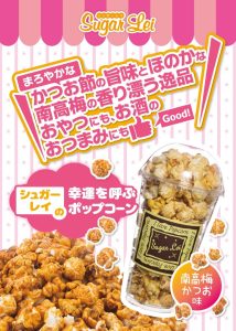 シュガーレイのポップコーンに「南高梅かつお味」が新登場しました。 まろやかなかつお節の旨味とほのかな南高梅の香り漂う逸品でおやつや、お酒のおつまみにも最適です。全国のスーパー等でお買い求め下さい。